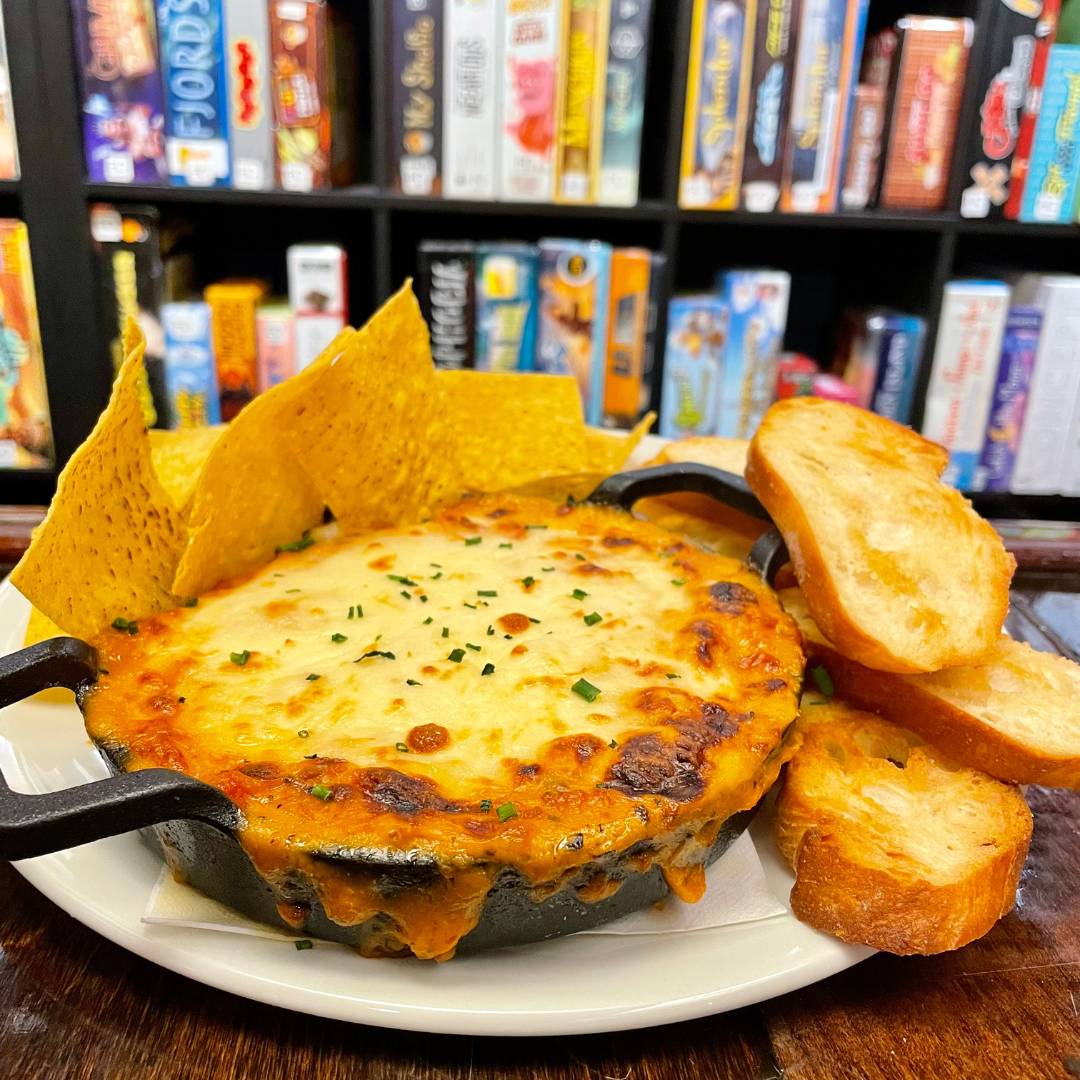 house made queso mixed with spicy italian sausage, and roasted red pepper, topped with melted mozzarella, chives, served with pita and corn chips