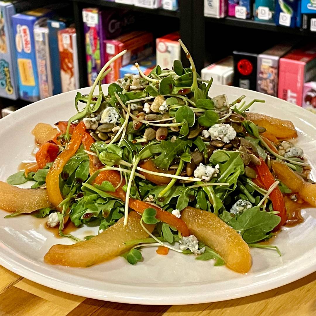 gorgonzola, roasted red pepper, roasted pear, pepita, and micros, on a bed of arugula, dressed with spicy honey and olive oil