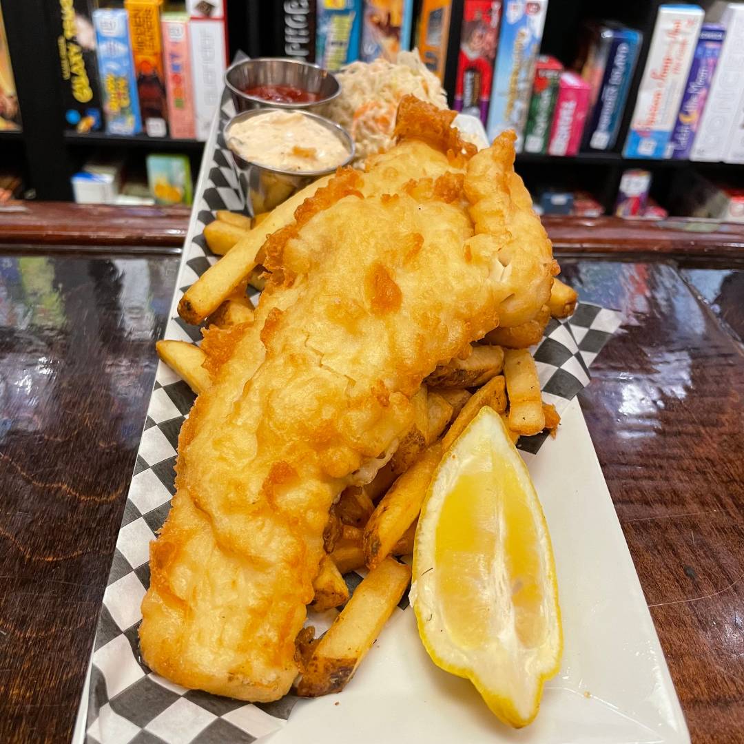 crispy beer-battered haddock fillet, served with house slaw, lemon wedge, tartar sauce, and fries. Shellfish cooked in same fryer as Fish.