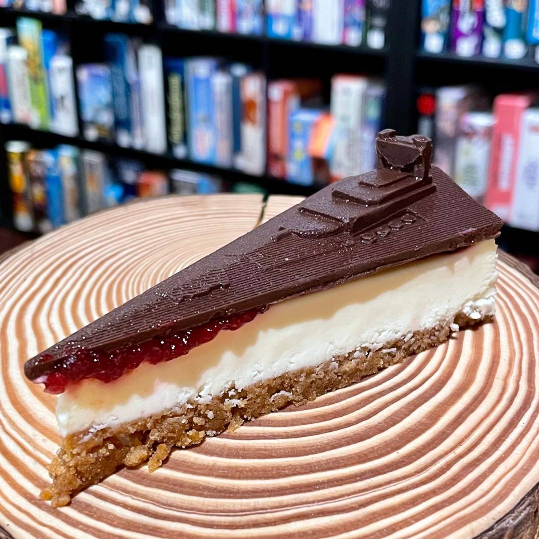 creamy cheesecake, topped with cherry gel, and a chocolate imperial star destroyer