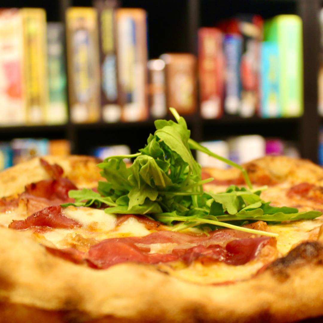 tomato sauce, buffalo mozzarella, prosciutto, topped with arugula