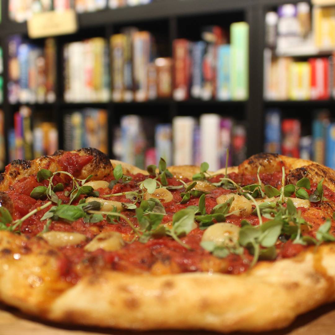 tomato sauce, micro basil, confit garlic, drizzled with pomegranate molasses [no cheese]