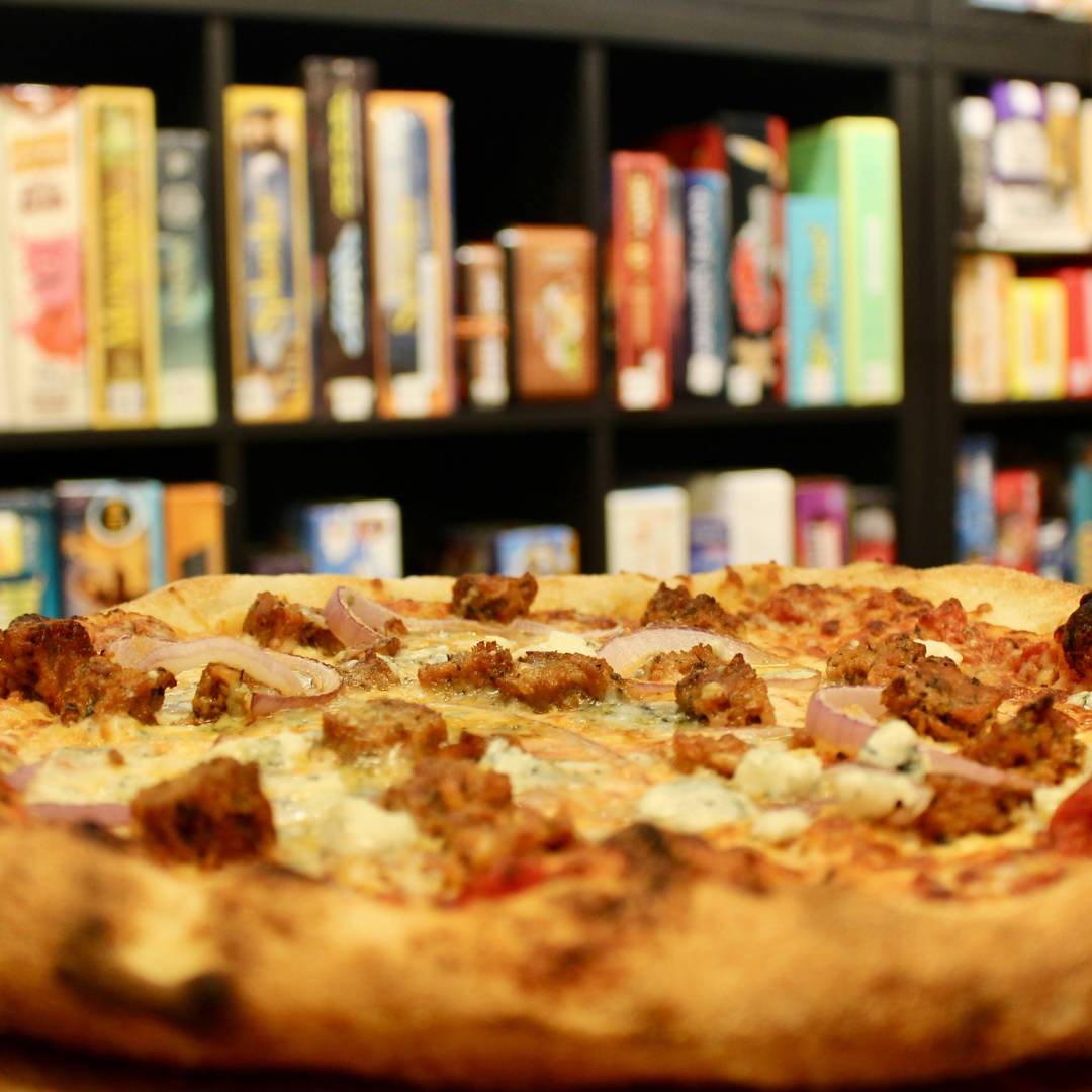 tomato sauce, mozzarella, spicy italian sausage, red onion, gorgonzola