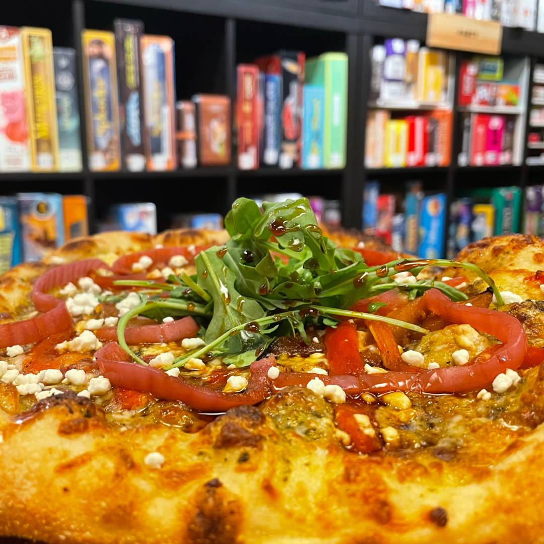chimichurri base, mozzarella, roasted red pepper, pickled red onion, spicy eggplant, goat cheese, topped with arugula, and pomegranate molasses