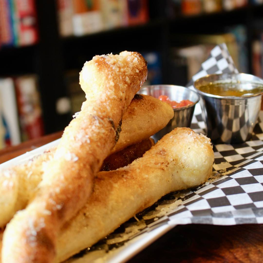 freshly baked breadsticks made from our pizza dough, tossed in vegan garlic butter, and topped with parmigiano, served with a side of marinara and garlic butter