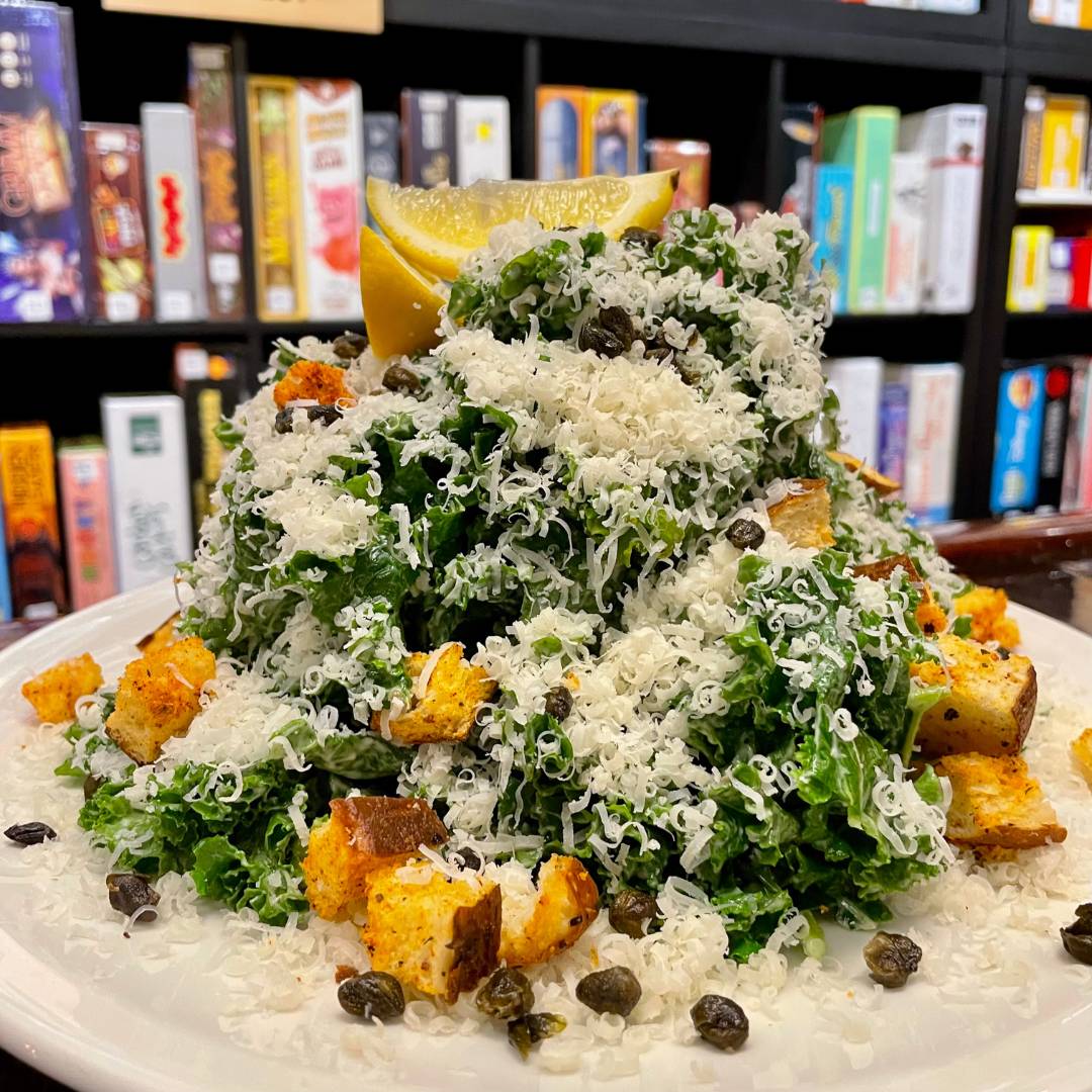 tender kale tossed with house caesar dressing and topped with parmigiano, cajun-spiced croutons, and fried capers
